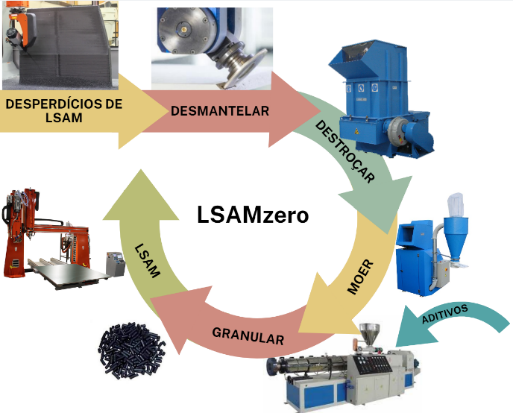 - Um ecossistema LSAM composto por módulo de FA (fabrico adito) híbrido e de corte (plataforma de grandes dimensões com pórtico permutável entre equipamento de extrusão de grânulos para FA, CNC para acabamento superficial e serra de corte para desmantelamento), módulo de trituração, modulo de moagem e módulo de composição e granulação;